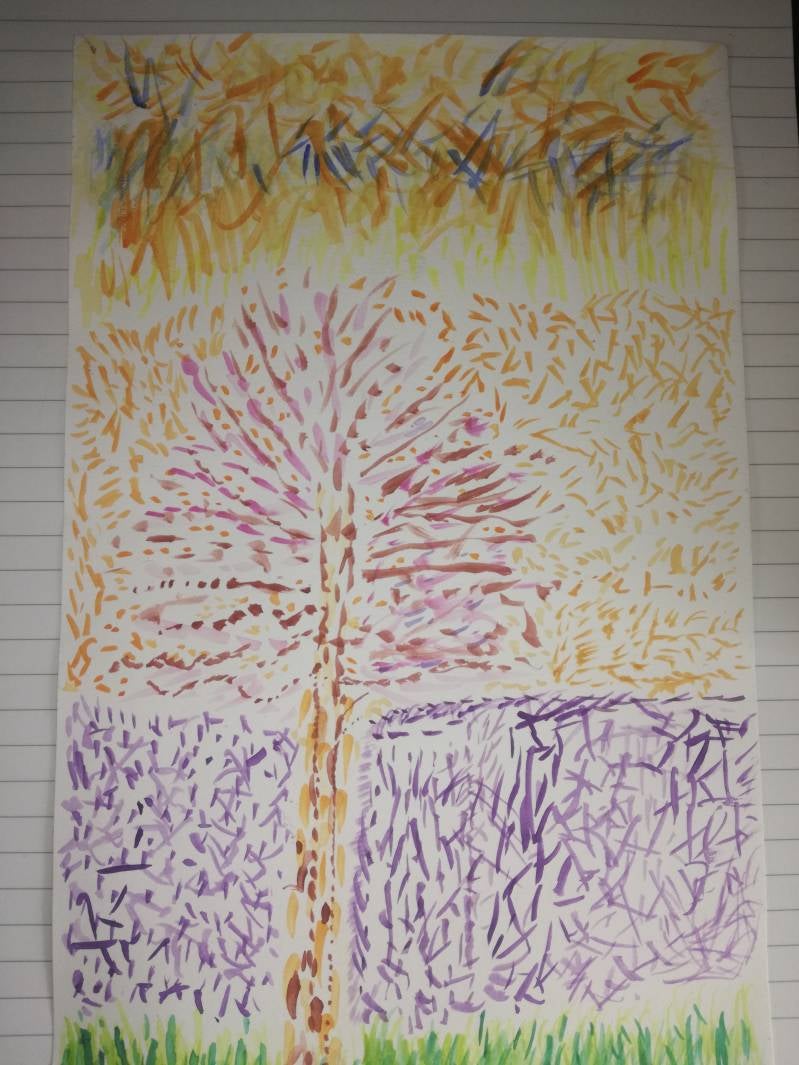 Zie hier, mijn impressionistische boom. Voor dit kunstwerk heb ik voornamelijk lichte kleuren gebruikt, om er vrolijkheid en positiviteit mee op te wekken. Ik heb geprobeerd om de kleuren rondom de boom z'n werk te doen door de boom in z'n kleuren te trekken. Hierdoor heb ik vaak dezelfde kleuren gebruikt, maar dan net iets met een lichter of donkerder tintje, zodat je nog wel kunt zien wat de kern is van dit werkstuk. Zoals je kunt zien, is het canvas in vier verschillende kleuren, delen, geverfd. Dat heb ik zo gedaan om de seizoenen weer te geven. Het groen staat voor bloei en zomer. Het donkerpaarse staat voor de winter waar het altijd een beetje grauw en somber is. Het oranje/bruin-achtig vlak staat voor de lente, de bladeren die van de bomen tot bloei komen en op een gegeven moment verdorren. Tot slot heb je het bovenvlak wat de herfst moet voorstellen, waarin alle kleuren bijeenkomen en zo een geheel vormen. 190117