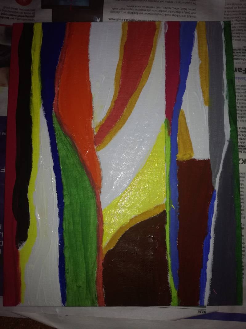 Het maken van dit Color field painting was leuk en zeer klodderig. Ik voelde me net weer een basisschoolkind. Ik wist zelf eerlijk gezegd niet meteen hoe ik moest beginnen, dus begon ik met het aanleggen van 'patronen/lijnen' waarin ik dan kleur zou doen. Ik heb hiervoor ook kleuren met elkaar gemengd, wat ik erg leuk vond om te doen. Ik ga verder niets zeggen hoe je deze Color Field Painting moet interpreten. Dat ligt helemaal aan jou en je ideeën. 180517